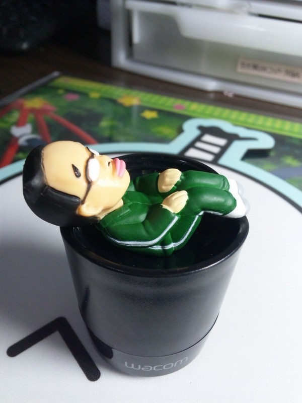 新しいペンタブに緑ジャージおじさんの鈴木さんもペン立ての中に入って喜んでいらっしゃるわ~