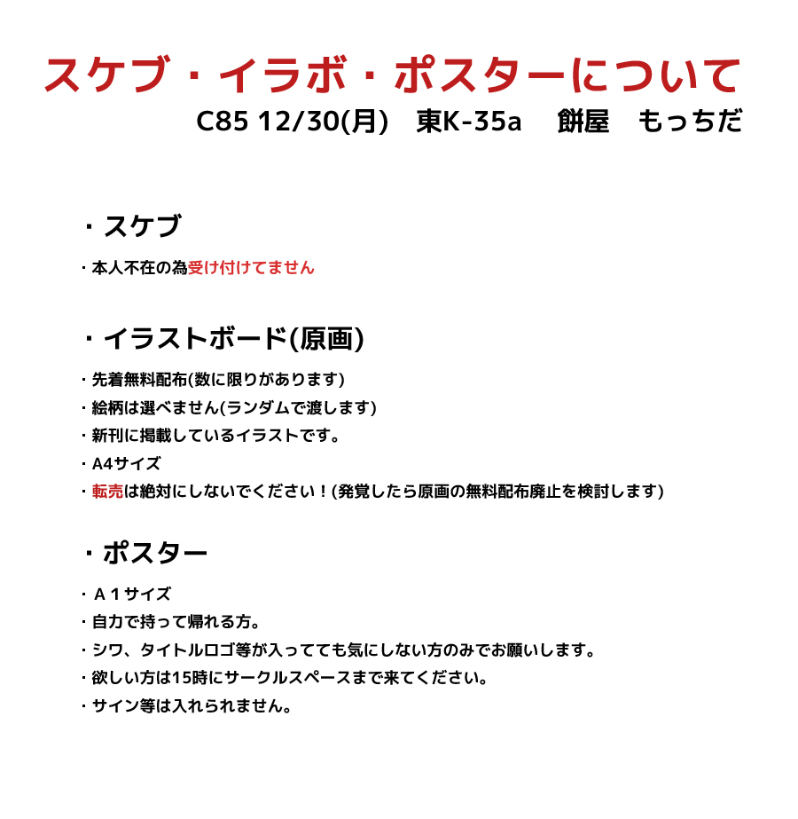 コミケ当日、残念ながら仕事の為行けません。
